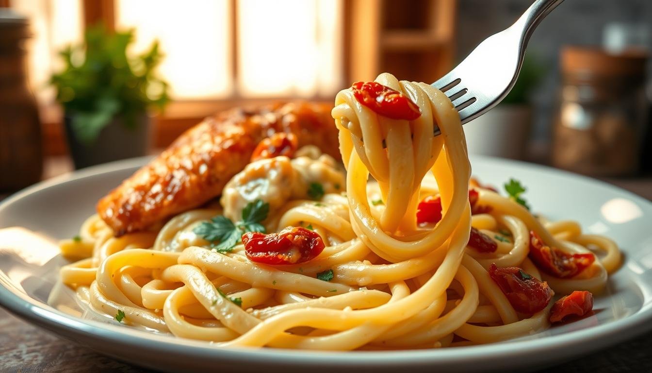 The dish’s charm comes from a mix of key elements. Sun-dried tomatoes add a tangy kick. The creamy sauce wraps around the pasta, making it rich and indulgent. Together, they create a dish that’s hard to resist.